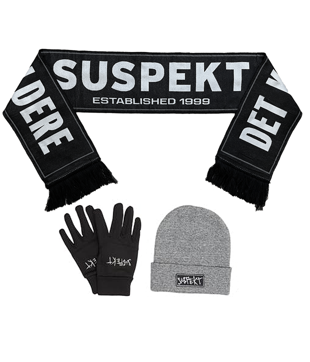 Hold dig varm med dette Suspekt vintersæt, der indeholder både smart gloves, halstørklæde og patch beanie.